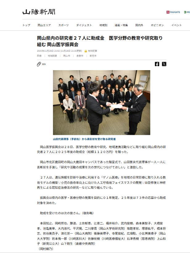 2025‐7年度 第25回公募助成式が岡山大学医学部第10カンファレンス室にて開催されました 2025.12.1